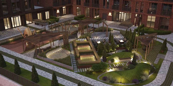 Двор в жилом комплексе Михайловский — это стильное и приватное пространство только для жителей. «Двор без машин»: плейхабы из натурального дерева, релакс зоны с дизайнерскими креслами и элементы геопластики — всё это формирует единое, уютное и, вместе с тем, высокотехнологичное пространство для отдыха, скрытое от посторонних глаз.